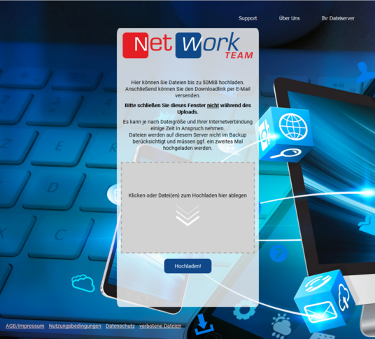 Mit unserem Dateiserver können Sie oder Ihre Kunden browserbasiert Dateien (z.B. bis 50 MB, dies ist individuell einstellbar) hochladen, und den Download-Link schicken Sie oder Ihre Kunden dann einfach per E-Mail an den Empfänger, so landen die Dateien beim Empfänger ohne das E-Mail-Postfach des Empfängers zu verstopfen.